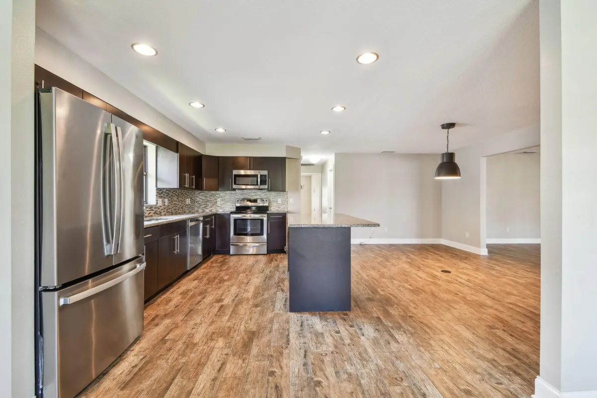 Open-concept kitchen with modern finishes, flowing into dining & entertaining spaces